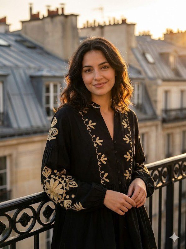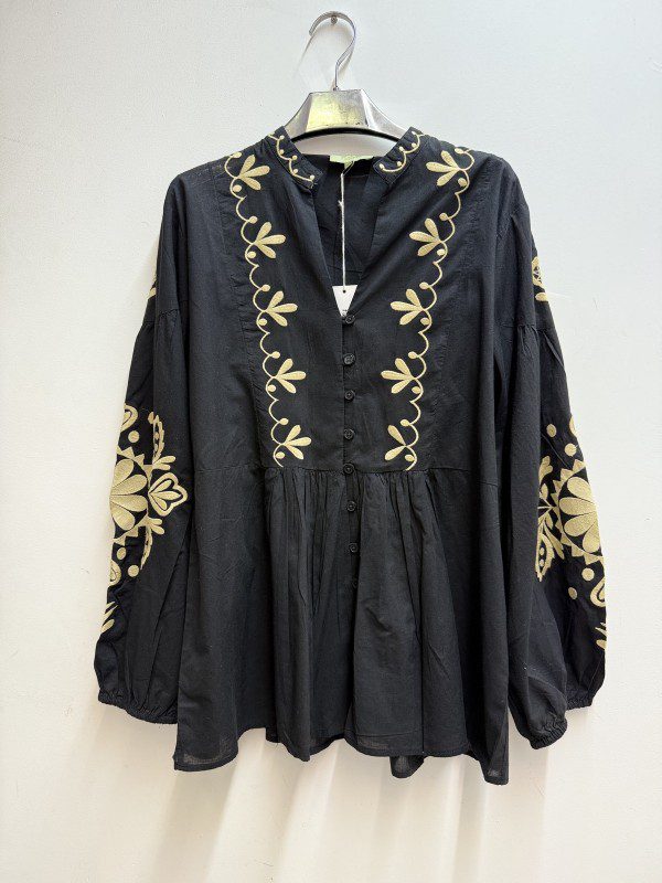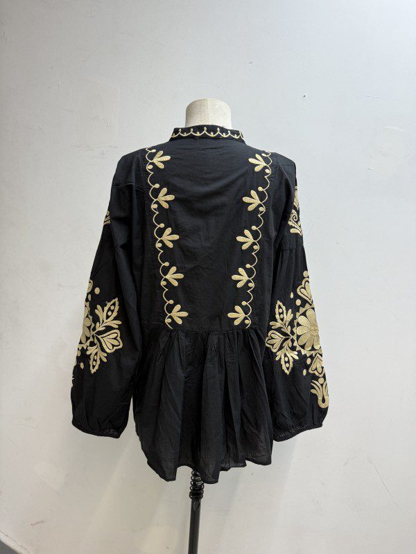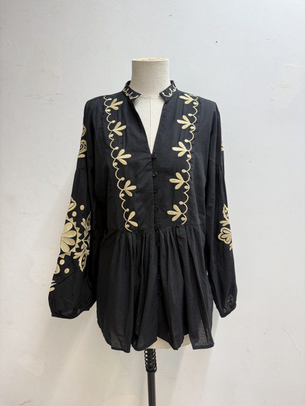Chemise féminine à col mao, ornée de broderies florales sur les manches. Boutonnée sur le devant, elle offre une coupe fluide et élégante, parfaite pour un look décontracté ou habillé.