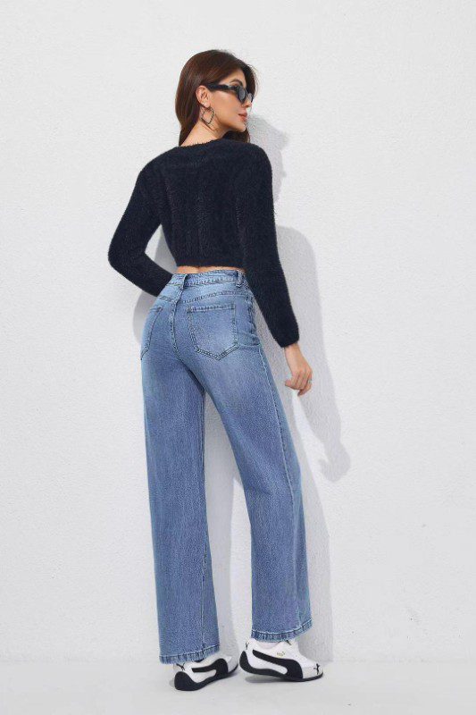 Jean couleur denim taille haute pour femme, coupe large et droite, parfait pour le printemps/été.